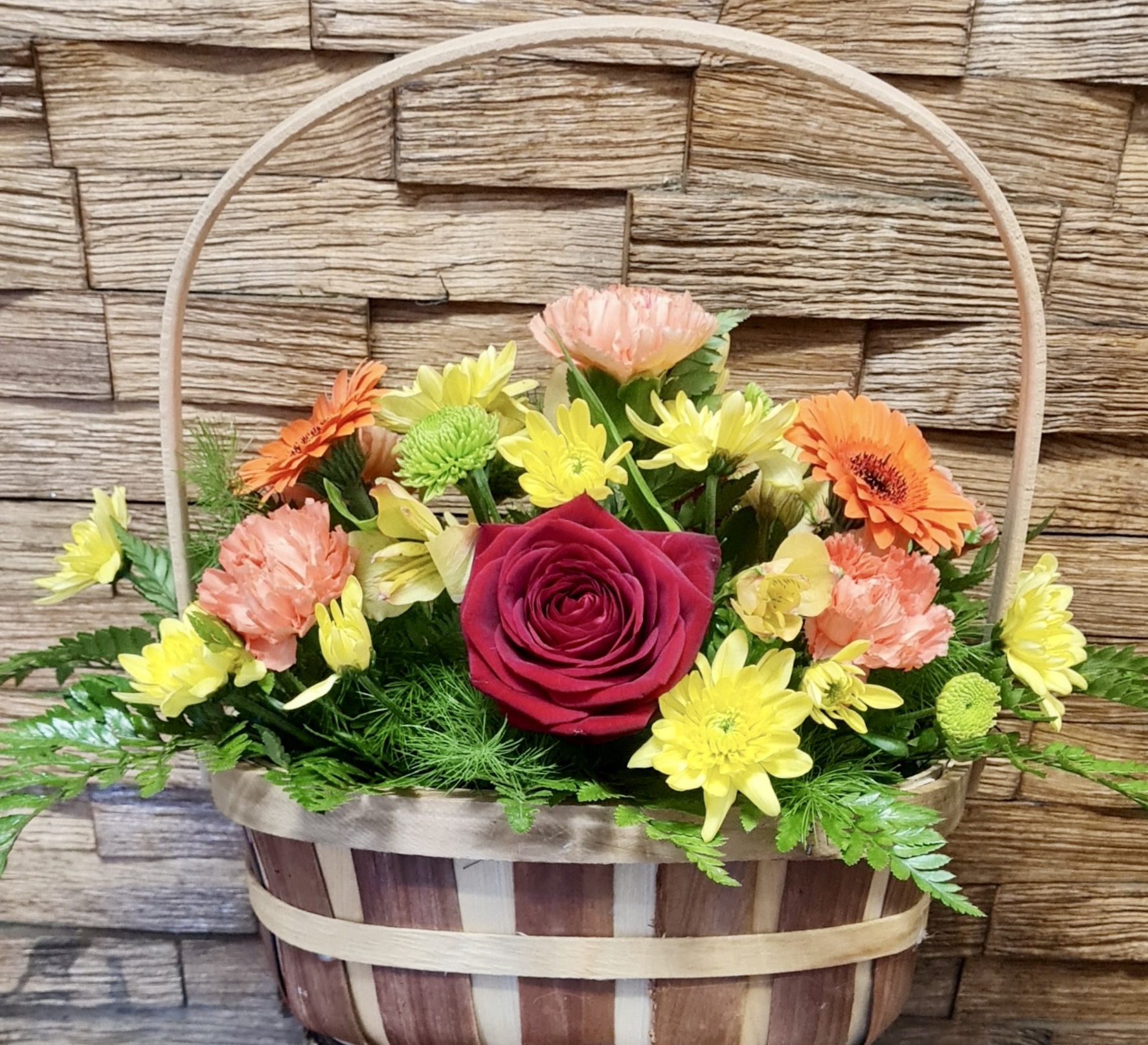A bright and pleasing traditional basket of vivid yellows and oranges & red broken with delicate shades of green foliage
